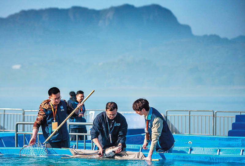 湖北省宜昌市长江珍稀鱼类放流点开展中华鲟保护宣传和增殖放流活动。图为工作人员将中华鲟捞至放流箱内(2024 年 3 月 28 日摄) 伍志尊摄 / 本刊生生不息:生态与生活双重变革