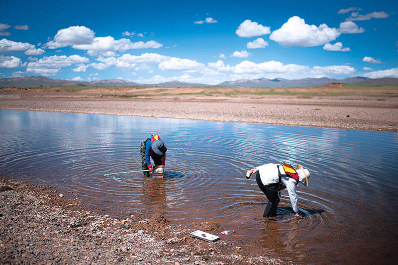 长江科学院科考队员在长江源区采集着生藻类样本(资料照片) 肖艺九摄 / 本刊