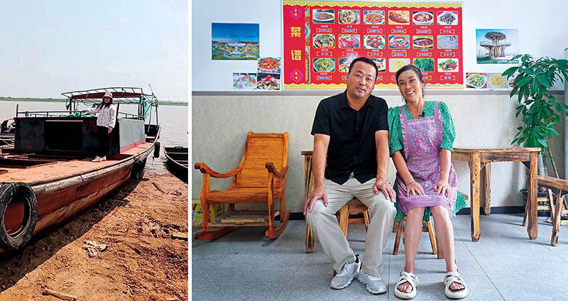 拼版照片:左图为江西省九江市永修县吴城镇退捕渔民何桂花与自家渔船合影留念(2020 年 3 月 20 日摄 资料照片);右图为何桂花和丈夫徐礼渊在自家开的餐馆里留影(2023 年 7 月 16 日摄 万象摄 / 本刊) 新华社发